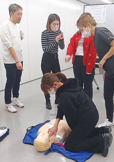 蘇生講習では、万が一の事態に備え、歯科医師と歯科衛生士がともに実習を行います。